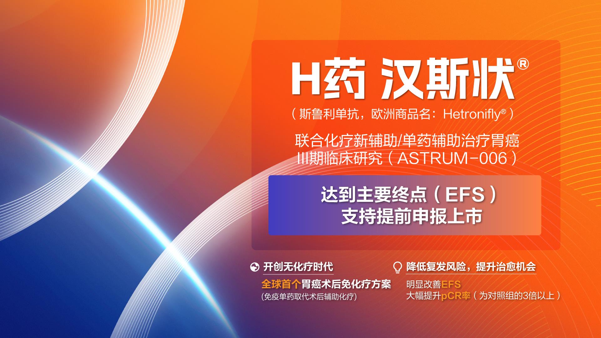 2025年10月9日,复宏汉霖宣布公司自研创新型PD-1抑制剂H药 汉斯状®(斯鲁利单抗,欧洲商品名:Hetronifly®)联合化疗新辅助/单药辅助治疗胃癌的III期临床研究(ASTRUM-006)期中分析达到了主要研究终点无事件生存期(EFS),成为全球首个胃癌围术期(术前/术后)以免疫单药取代术后辅助化疗的治疗方案,实现了该领域的重大突破。